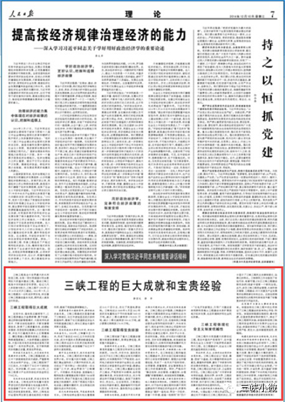 12月10日出版的《人民日报》7版(理论版)刊发题为《三峡工程的巨大成就和宝贵经验》的总结性文章。